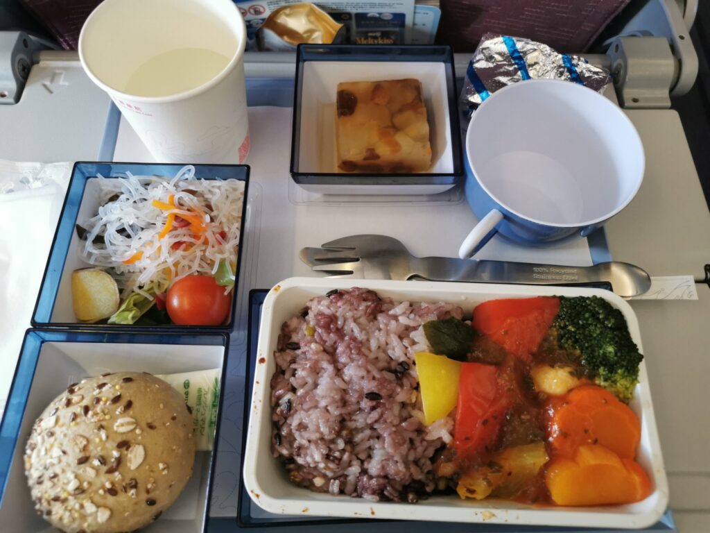 最近は 格安航空会社 LCC にばかり 乗っていたので、久しぶりのフルサービスの飛行機です。荷物は預けてみました また 機内食はベジタリアン メニューをリクエストしておいたので誰よりも早く 運ばれてきました。